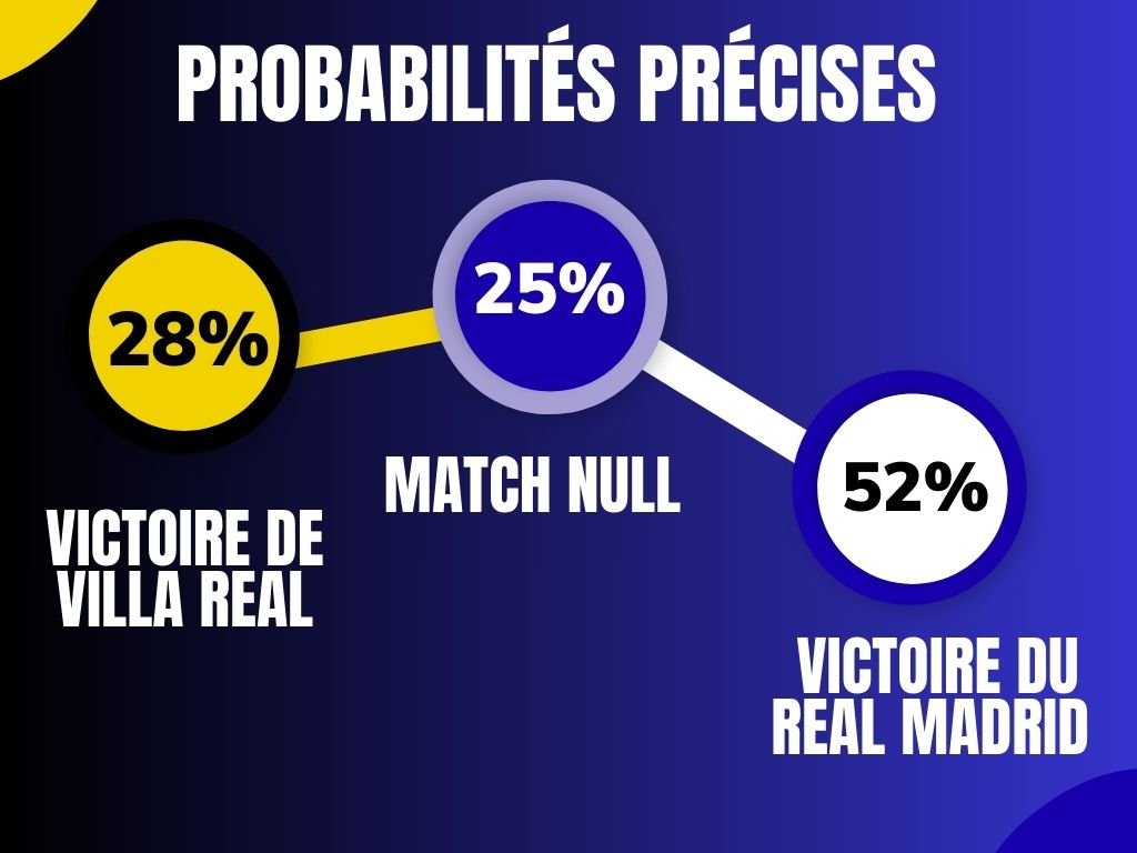 Les probabilités penchent clairement en faveur d’une victoire madrilène, avec plus d’une chance sur deux de succès à l’extérieur. Le nul reste une option crédible, tandis qu’une victoire de Villarreal apparaît moins probable, bien que pas totalement à exclure.